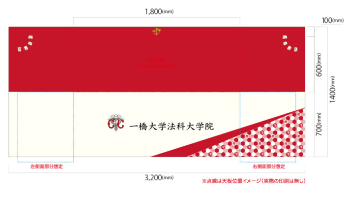 正面・左右面が生成り色、天面が赤色で、大学院名や校章、鹿の子模様などが入ったこちらのデザインから名入れ作成を行いました。