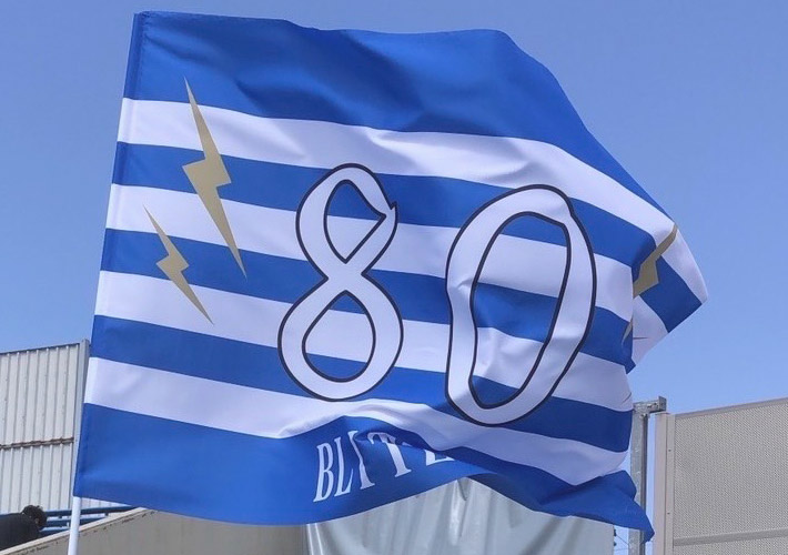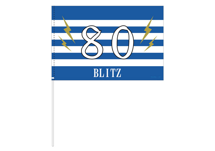 青と白のボーダーの中央に「80」の文字と稲妻マーク、下部にロゴが入ったこちらのデザインから名入れ作成を行いました。