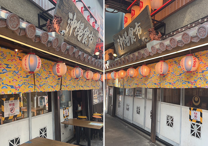 沖縄をイメージした華やかなデザインが目を引き、明るい気分になる店舗のれんに仕上がっています。