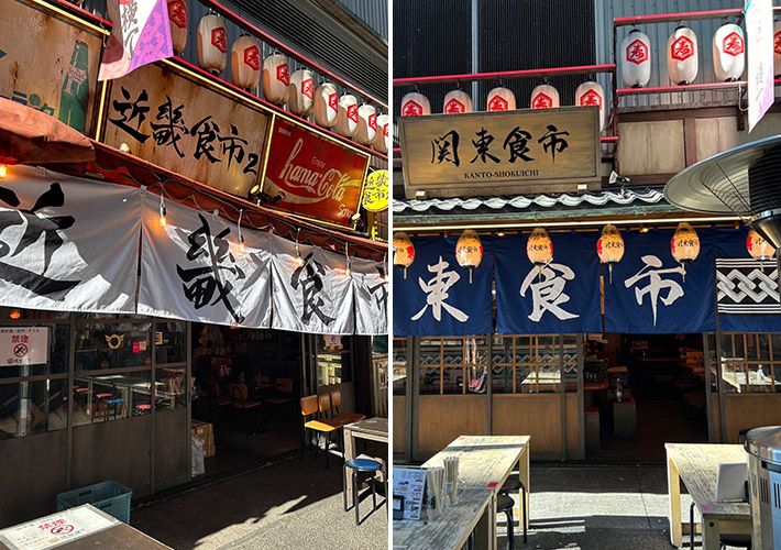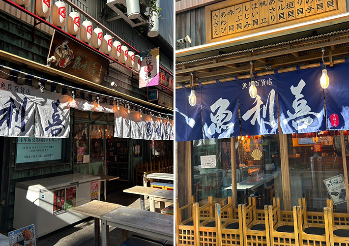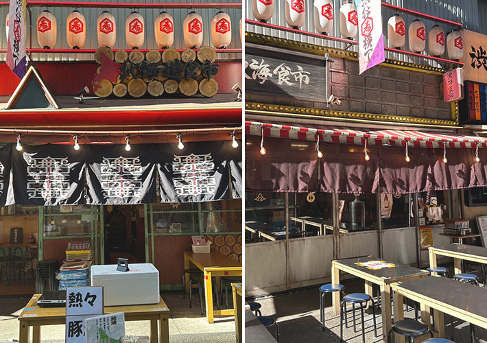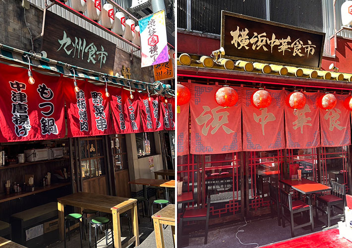 こちらは紺地に白色で店舗名が入ったのれん、白地に紺色で店舗名が入ったのれんで、どちらも赤色の落款デザインがアクセントになっています。