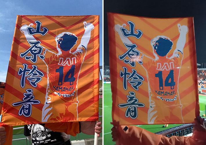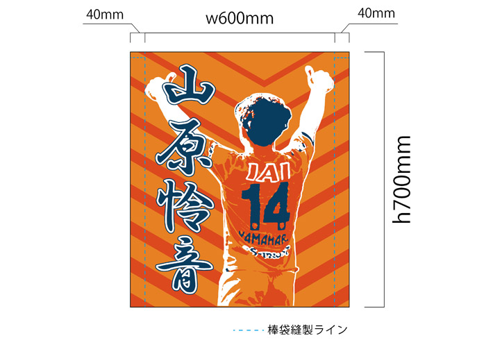 薄手のテトロントロピカル生地に選手のお名前とイラストを名入れした鮮やかなオレンジ色のゲーフラは、昼夜問わず目立つこと間違いなし! 観客席を彩るその姿は、選手を鼓舞する事でしょう。