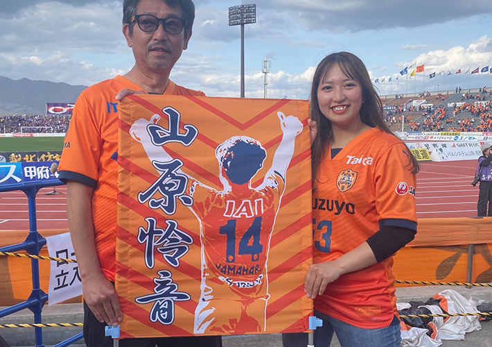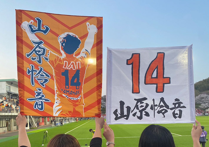 チームカラーをベースに、選手のお名前と後ろ姿が入ったデザインにて名入れ制作を行いました。