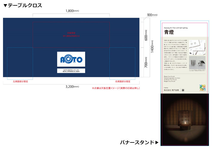 テーブルクロスは正面にロゴ色のデザイン、バナースタンドは企業様が携わる新ブランドのコンセプトを紹介するフルカラー写真入りのデザインから、それぞれ名入れ作成を行いました。
