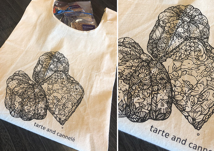 黒1色のシルク印刷を施し、細かい線を使った繊細なイラストと店舗名をプリントいたしました。
