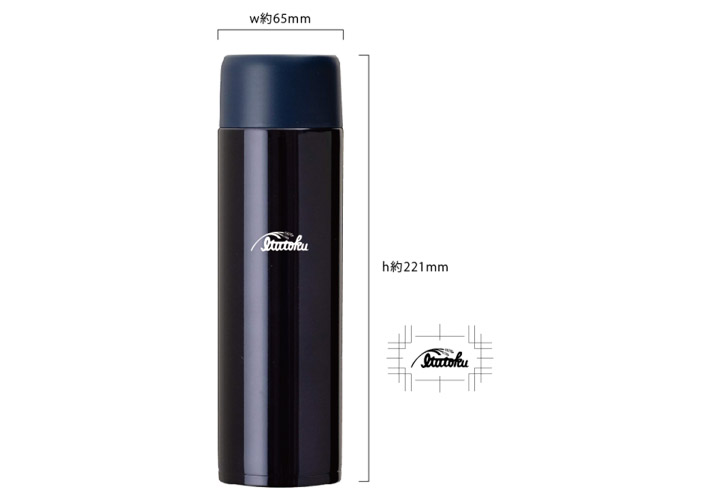 ネイビーカラーのマグボトルに白1色のパッド印刷を施し、イラストと英字が入った小さなワンポイントロゴをプリントいたしました。
