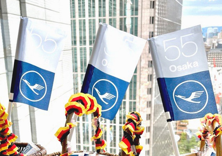 大阪就航55周年を記念したメッセージとツルのロゴをプリントした手旗は、ダイレクト印刷にて作成致しました。