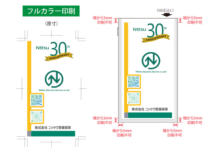 名入れ範囲の広いフルカラープリントにて、企業ロゴと周年ロゴ、そして2つのQRコードを印刷しております。
