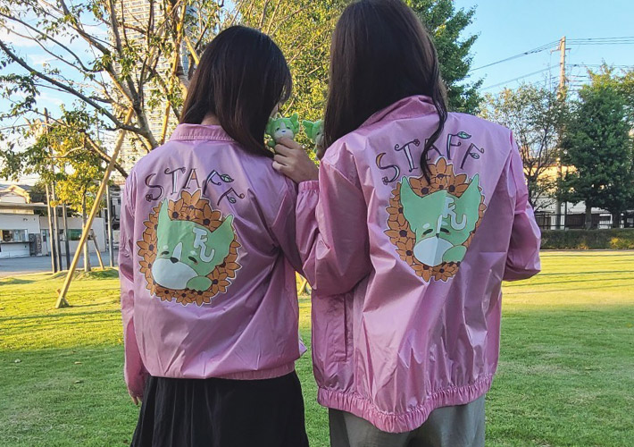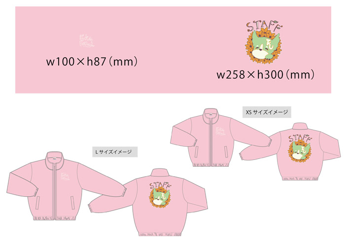 ライトピンクのブルゾンに、転写印刷によってプリントした淡い緑色のキャラクターのイラストが可愛らしいカラーリングになりました。