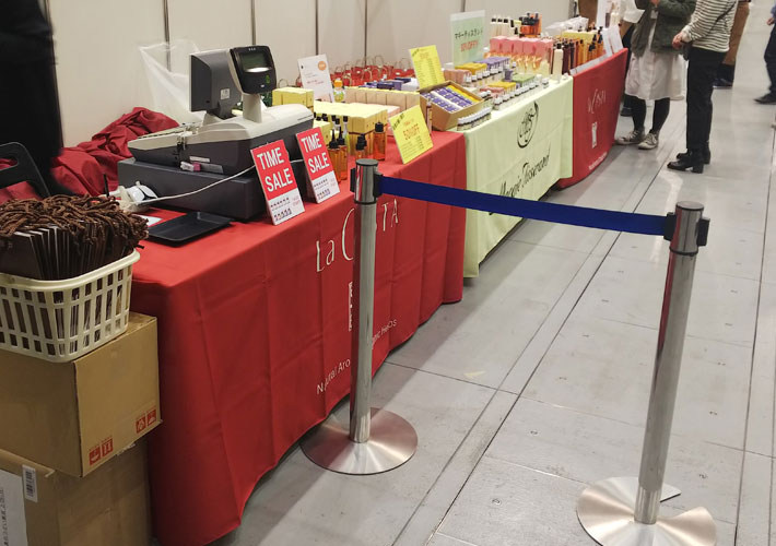 2種類のカラーのロゴ入りテーブルクロスを交互にご使用いただき、遠くからでも目を引く販売ブースになっていますね!