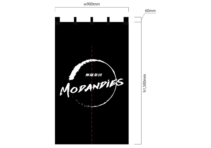 のれんのサイズは一般的な戸幅に合わせたw900×h1,500(mm)で仕立てていますので、公演場所が変わる際も柔軟に対応できることと存じます。