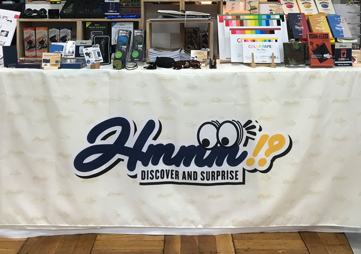 ブランドロゴが鮮やかに印刷され、アイキャッチ効果抜群のテーブルクロスに仕上がりました。商品の陳列棚に特注テーブルクロスを敷くだけで、雰囲気がぐっと華やかになりますね!