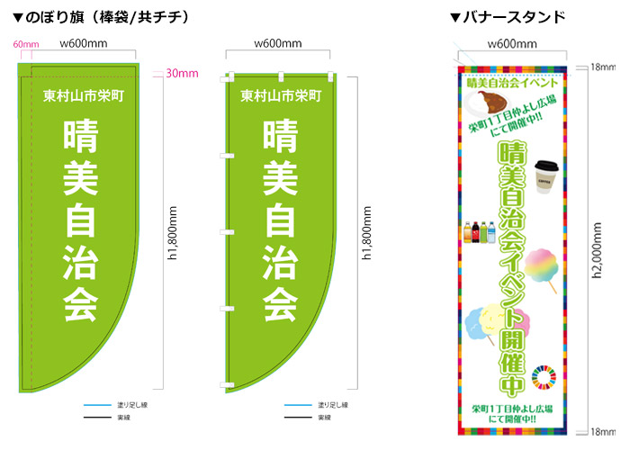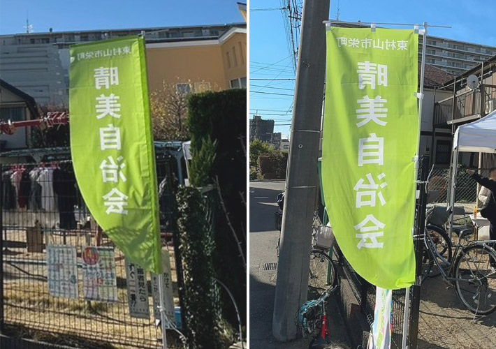 Rのぼり旗は黄緑色の地に白色で自治会名を入れたデザイン、バナースタンドはイラストと文字を入れたカラフルなデザインから名入れ作成を行いました。