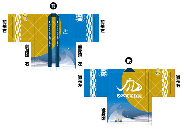 左側は黄色、右側はブルーを基調とし、背面にロゴ、袖や裾に和柄とイラストを入れたこちらのデザインから名入れ作成を行いました