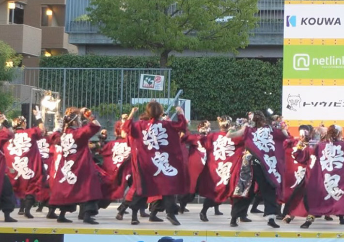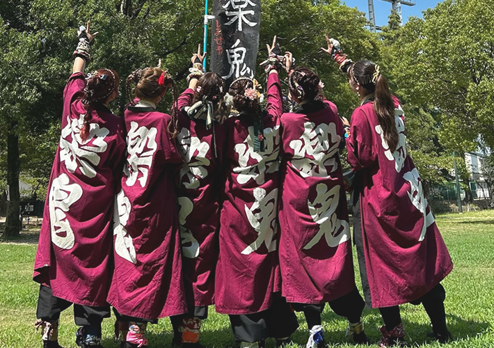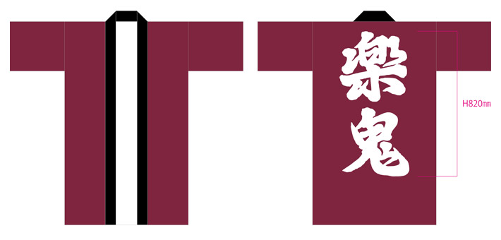 背中に名入れされた「楽鬼」の大きな文字が目立つ演舞の衣装に相応しいダイナミックなデザインの長法被を製作致しました。