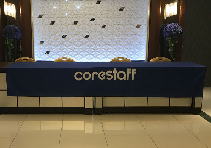 シンプルな名入れを行うことで、説明会や社内セミナーなど様々なシーンで繰り返し使用することが可能です。コーポレートカラーなどを使ったテーブルクロス制作も当店にお任せください!