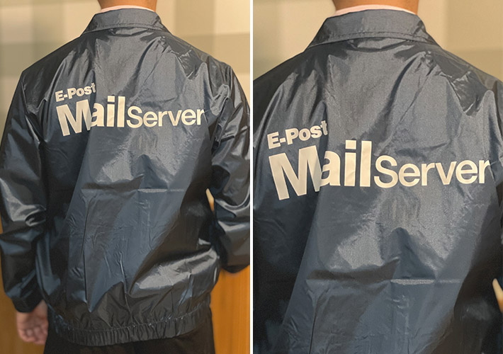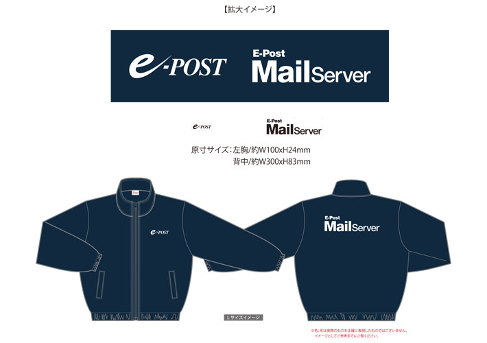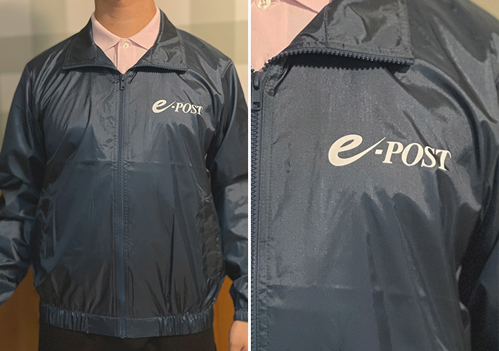 左胸面にワンポイントのロゴ、背面に大きく自社製品名が入ったこちらのデザインから名入れ作成を行いました。