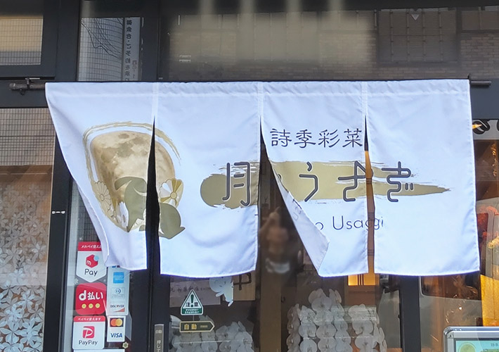 白地に月とうさぎのイラスト、店舗様のお名前を入れたこちらのデザインから名入れ作成を行いました。