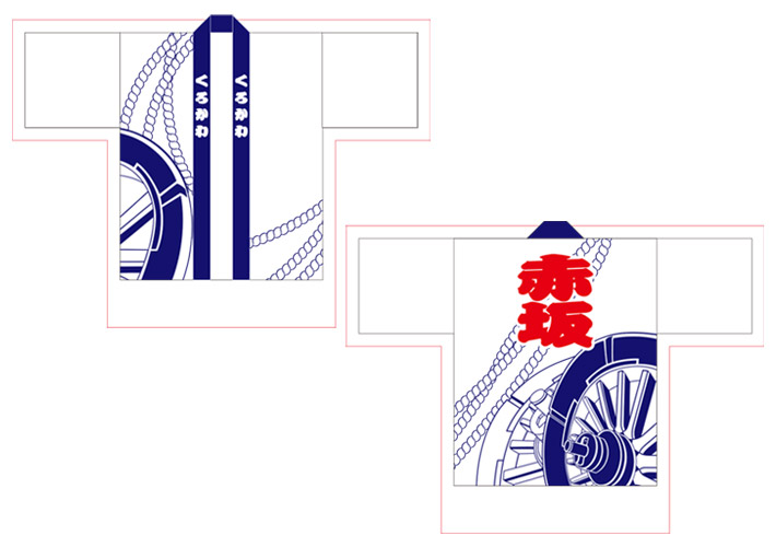 襟部分にお名前、正面と背面に車輪や縄の絵柄、文字が入ったこちらのデザインから名入れ作成を行いました。