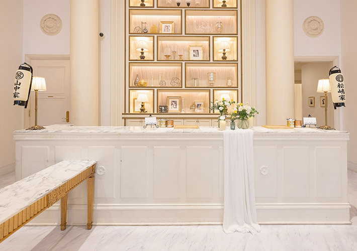 弓をランプシェードに引っ掛け、受付カウンターの装飾にもお使いいただきました!