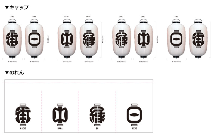 提灯はロゴの文字を正面と背面に一文字ずつ、のれんは各巾の中央にイベントロゴを入れたこちらのデザインから名入れ作成を行いました。
