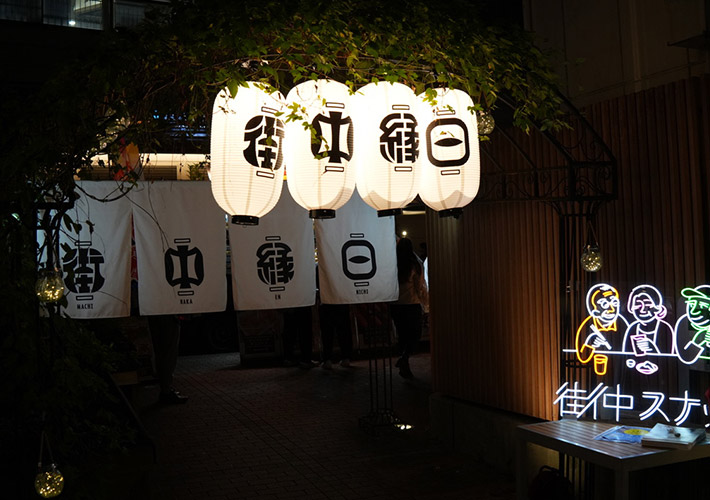 街中にスナックのような交流の場を作るというイベントということで、飲み屋をイメージさせる提灯とのれんの組み合わせは、来場者に親しみや懐かしさを感じていただけるのではないでしょうか。