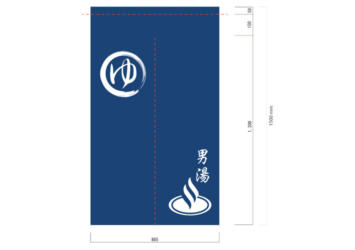左上に「ゆ」の文字、右下に温泉マークと男湯の文字を入れたこちらのデザインから名入れ作成を行いました。