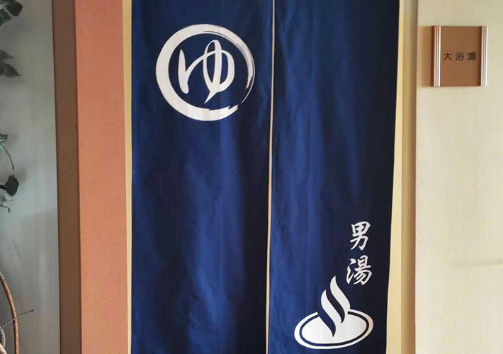 紺色の地に白色で温泉マークと文字がくっきりと染めぬかれ、男湯の場所が一目でわかる視認性の高いデザインです。