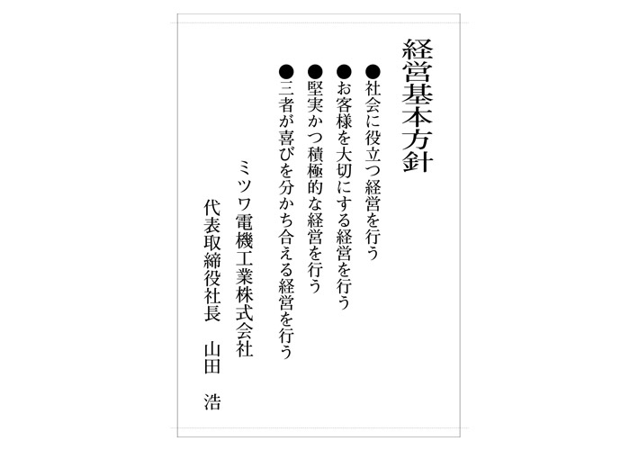 白色の背面に経営方針を入れたこちらのデザインから名入れ作成を行いました。