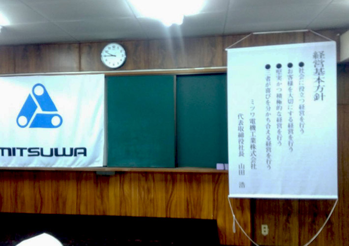 企業様の経営方針をプリントした特注タペストリーは、屋内設置用の定番である中厚生地のトロマットに昇華転写にて作成しております。