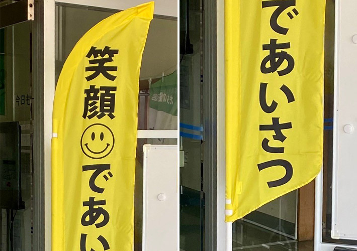 そのため、入口にこちらのスウィングバナーを設置すると、自然に「笑顔であいさつ」のスローガンが目に飛び込んで挨拶を意識するきっかけになりますね!