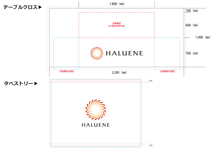 テーブルクロスは前面、タペストリーは中央にそれぞれロゴを入れたこちらのデザインから名入れ作成を行いました。