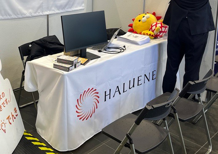 来場者様の目に留まる前面に大きく企業ロゴをプリントしたテーブルクロスは、ブースに華やかさをもたらします。