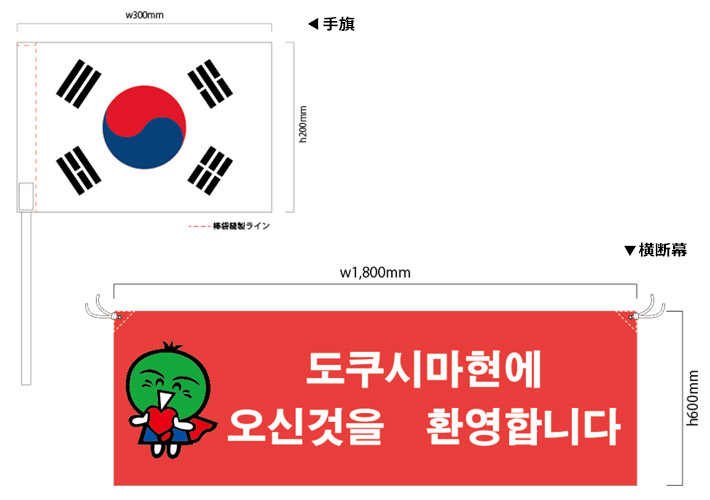 手旗は韓国の国旗、横断幕はマスコットキャラクターのハングルのメッセージが入ったデザインからそれぞれ名入れ作成を行いました。