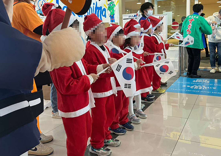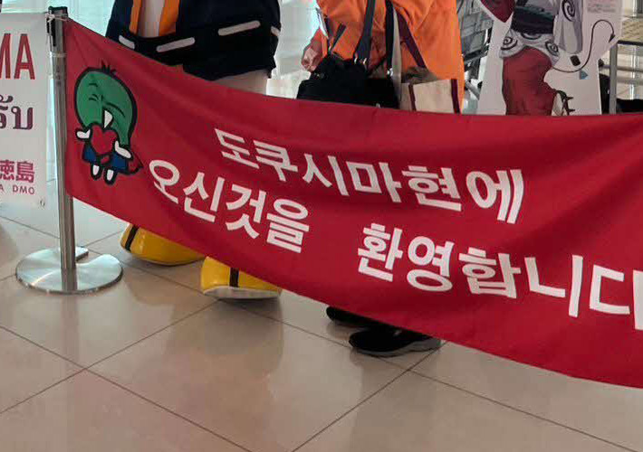 ハングルで「徳島県へようこそ」と書かれた横断幕は、赤地に白い文字が映えてすぐ目に留まりますね。