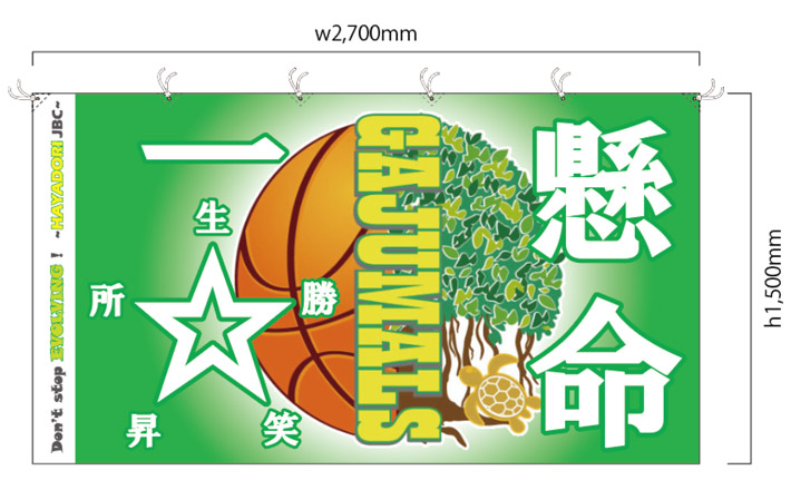 特注幕のサイズはご自由にオーダー出来、今回は体育館に掲揚するのに十分な存在感を発揮する大きめのw2,700×h1,500mmサイズにて作成いたしました。