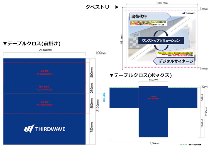 タペストリーは文字と写真の入ったフルカラーデザイン、テーブルクロスは正面にロゴが入ったデザインと無地デザインの2種類から、それぞれ名入れ作成を行いました。