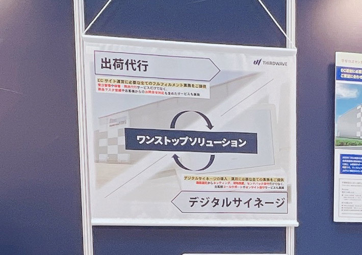 写真を背景に事業の特徴を説明するタペストリーは、企業様への理解が深まる展示会の壁面装飾に最適なデザインです。