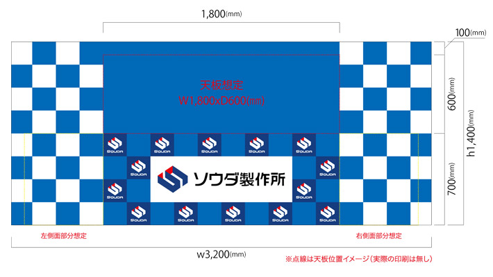 一般的な長机のサイズにフィットするw3,200×h1,400mmサイズで仕立てたテーブルクロスは、前面に企業様のお名前とロゴを散りばめた市松模様を印刷しているので来場者様の印象に残ります。