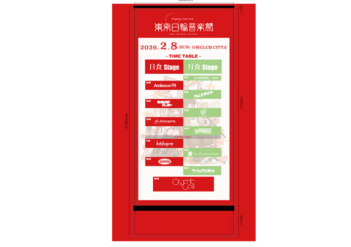 赤を基調とし、メインイラストを背景としたメディアには、イベントのロゴと開催日時、出演されるバンド様のロゴが登場順にプリントされています。