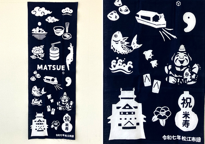 紺色の地に白色で染め抜かれているのは、松江城や遊覧船などの松江市のならではモチーフや、長寿のお祝いに相応しい縁起物です。