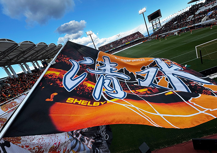 青空のスタジアムに映えるオレンジ色の応援旗で、試合を盛り上げていただければ幸いです。