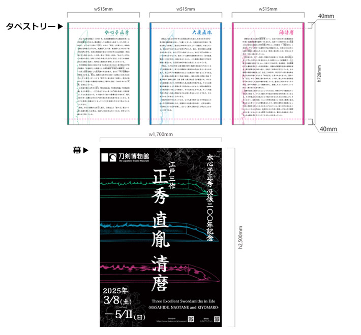 タペストリーは展示品にまつわる説明文を入れたデザイン、幕は企画展のポスターデザインからそれぞれ名入れ作成を行いました。