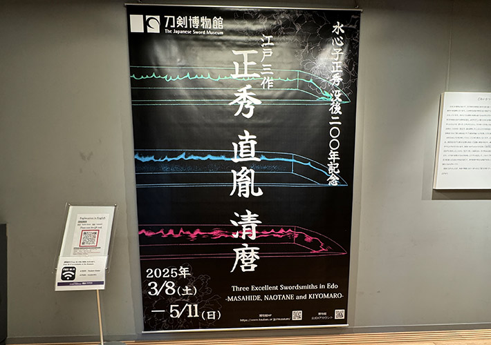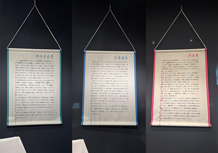 展示品にまつわる人物のキャプションをプリントしたタペストリーは、3枚とも縁取りや背面に印刷された刀のイラストが異なります。