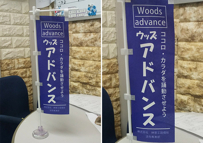 社内部署様のチーム名を大きくプリントしたミニのぼりは目立ちやすく、まさに街頭などでよく見かけるのぼり旗をそのまま小さくしたようなインパクトのある装飾に仕上がりました。