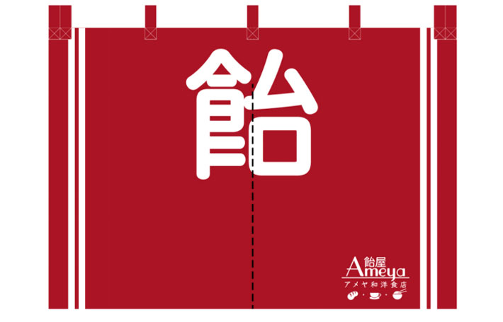 エンジ色のベタ地デザインを反応染めにて再現いたしました。色鮮やかな仕上がりで軒先の印象も明るくなりますね!細かい店舗ロゴも綺麗に仕上がっています。