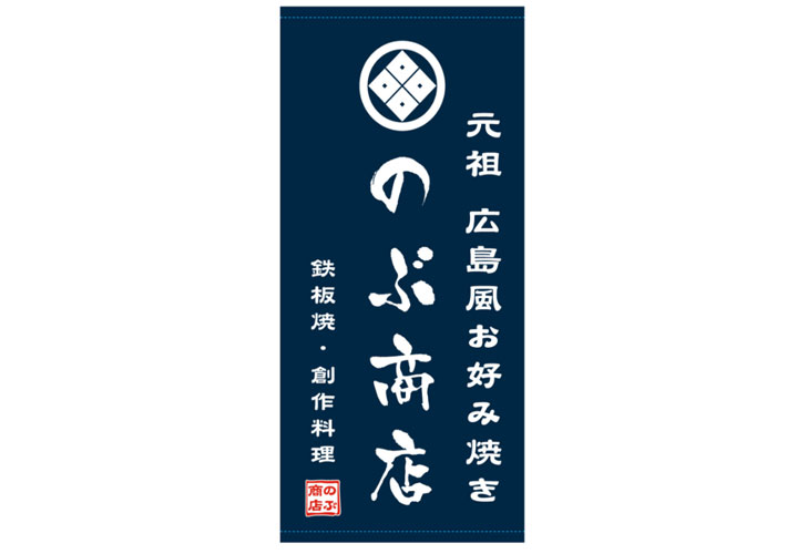 紺色のベタ地に店舗名などが入った、縦長サイズのデザインから名入れ製作を行いました。