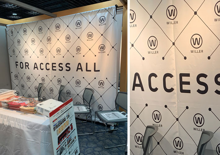 横長タイプのバナースクリーンをブースの背面装飾としてご活用頂いております。