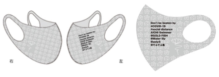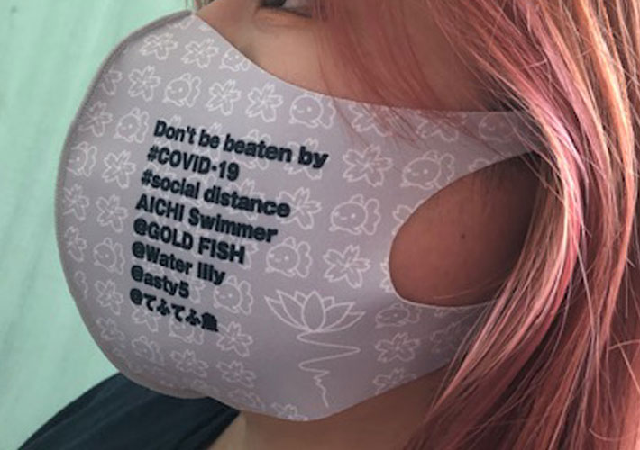 花などのイラストを使った総柄デザインが、耳掛け部分まで綺麗にプリントされました。黒色の文字入れがくっきりと目立つ仕上がりです!