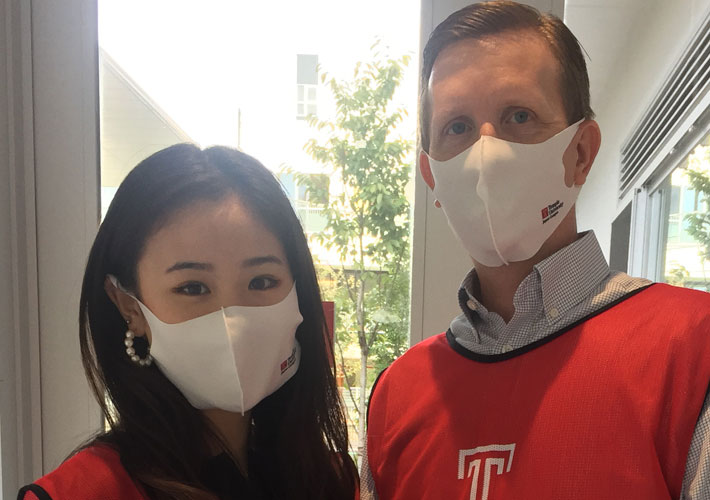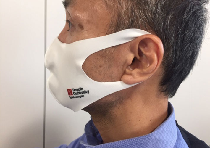 昇華転写印刷により、白地のマスクに大学ロゴをくっきりとプリントしています。