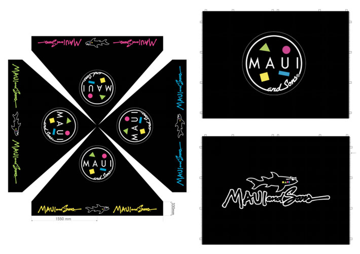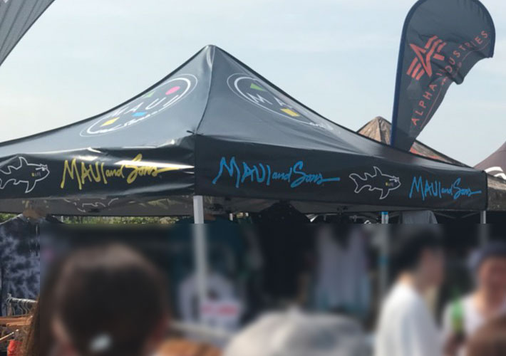 雨に強いターポリン2類生地を使ったテントの天幕にカラフルな文字入れやロゴが映え、サーフ系のおしゃれなテントに仕上がりました。ブランド様の屋外ブースとしてご活用頂いています!